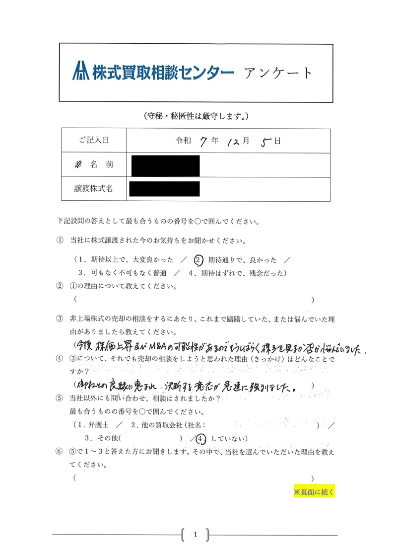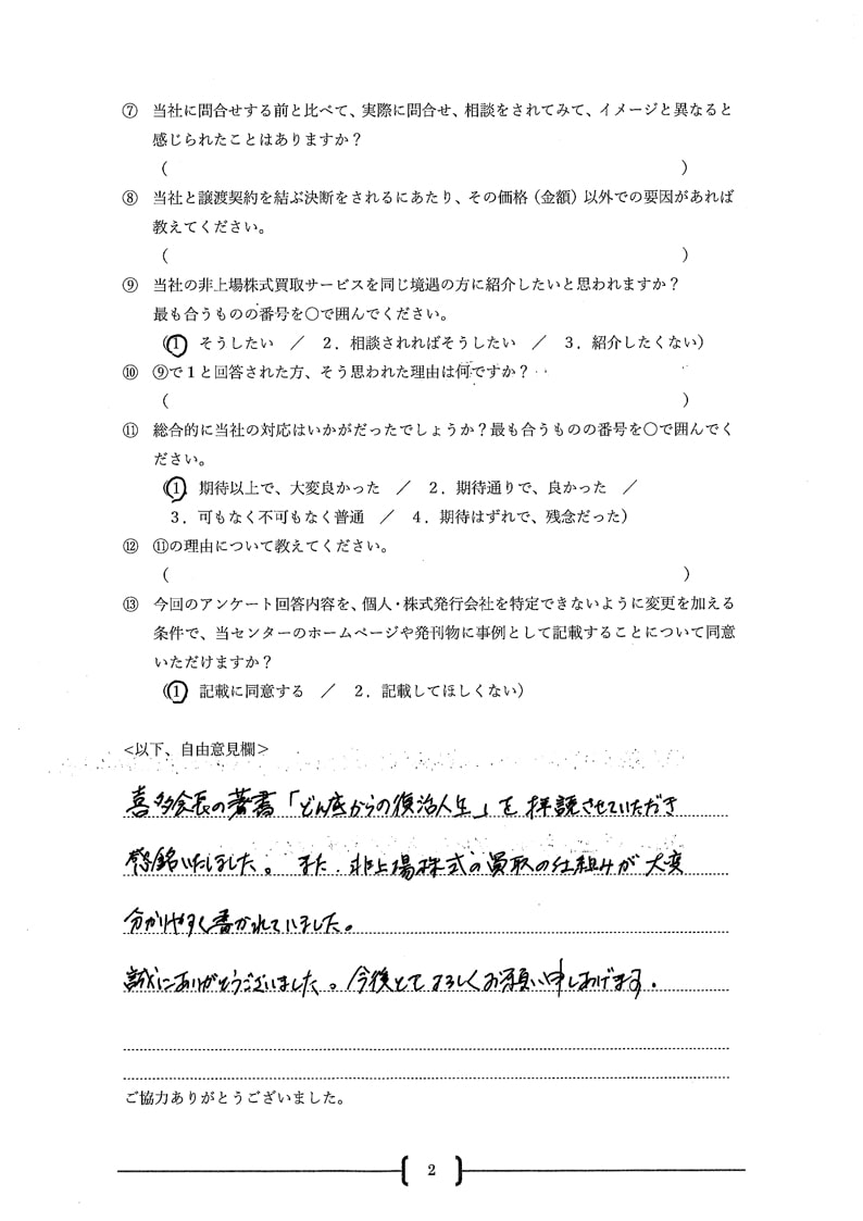 御社のおかげでこの株式から逃れることが出来、ご家族も大喜びでらっしゃいます。