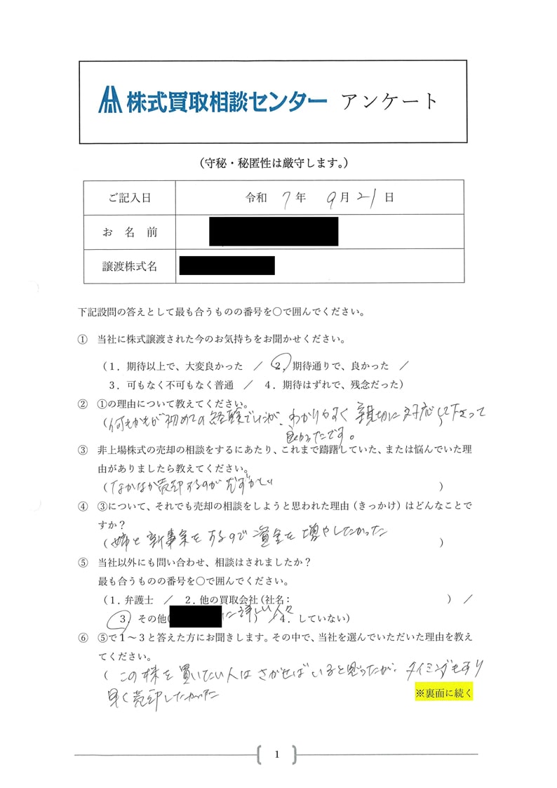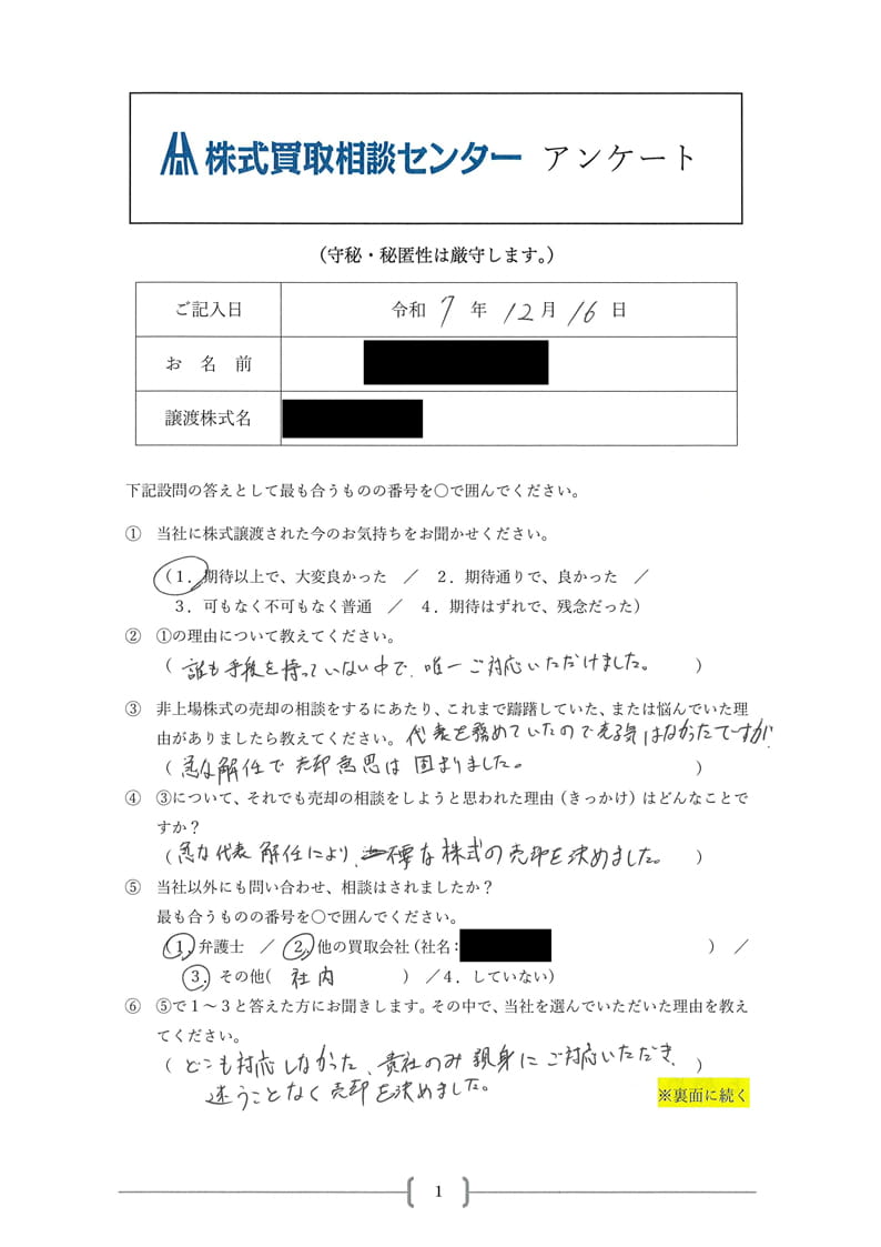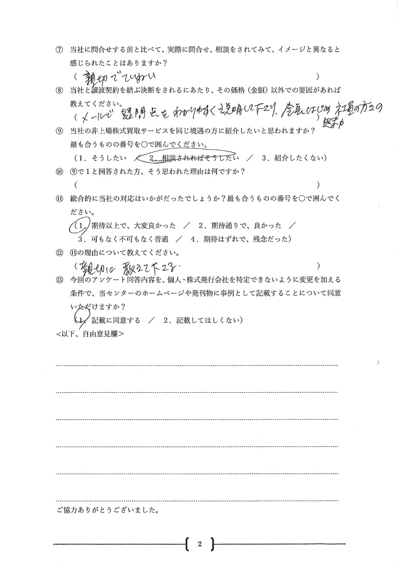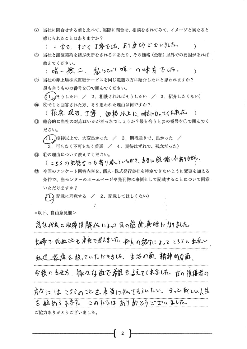御社のおかげでこの株式から逃れることが出来、ご家族も大喜びでらっしゃいます。